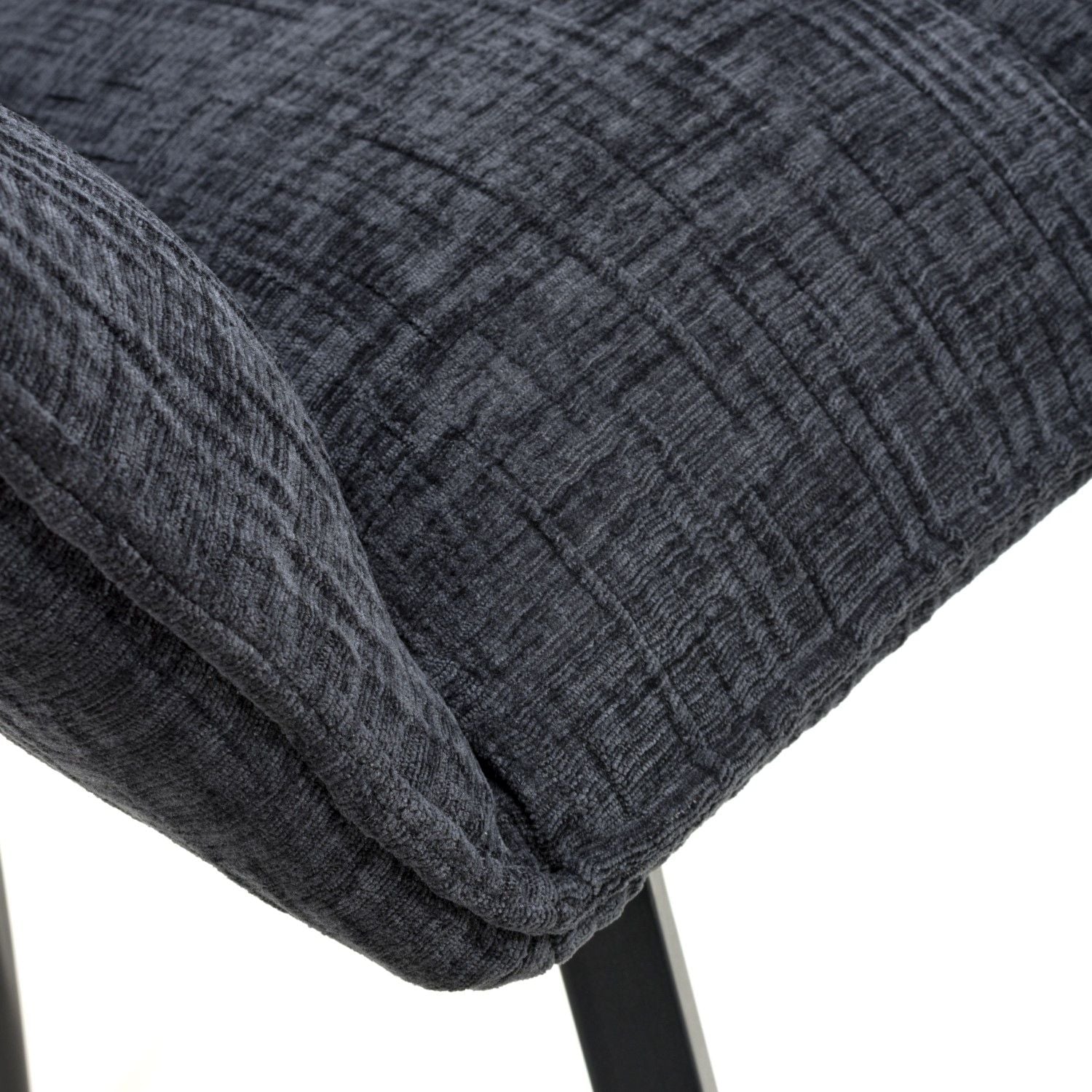 An ultra modern swivel dining chair in a striking angular design. Its pointed corners and feature triangular cutout exude contemporary style. The invitingly pleated plush charcoal upholstery comes in a subtle textured weave pattern. The seat smoothly swivels 180 degrees before gently returning to a central position. The black metal cross frame base drops down into sleek, pointed legs with adjustable feet. Assembly required. Sold in boxes of 2.