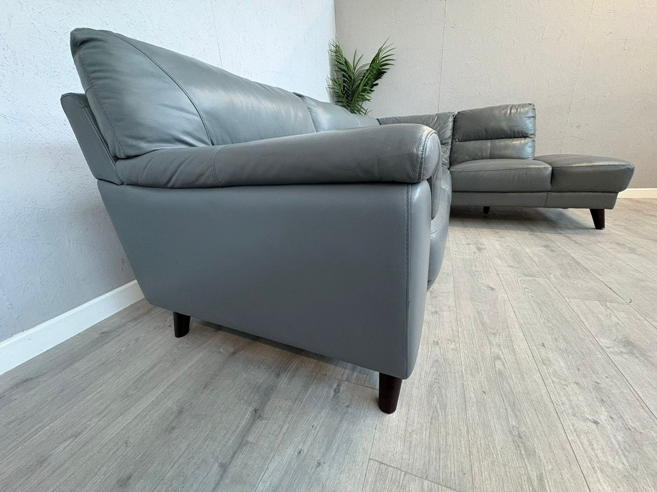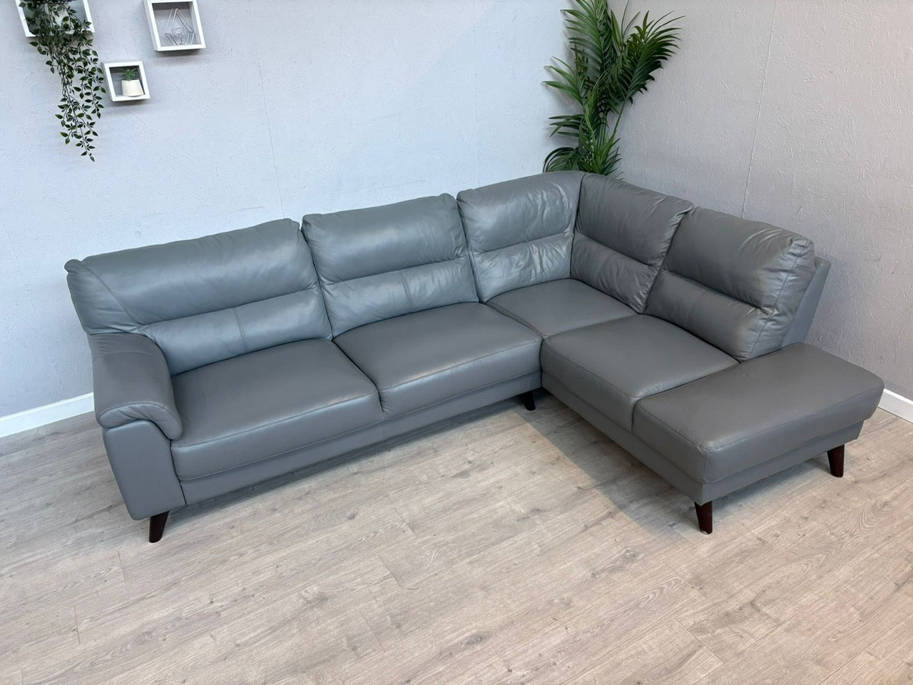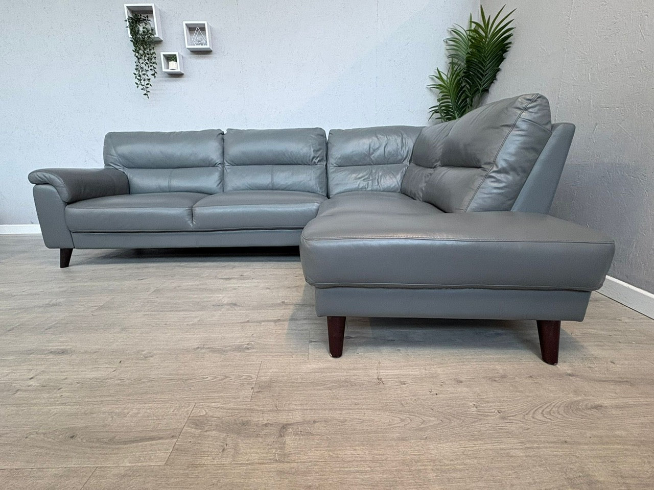 Discover sophisticated comfort with this stunning corner sofa, featuring a sleek grey leather cover that's both elegant and easy to maintain. The modular design offers flexible arrangement options, while the chaise end on the right provides the perfect spot to stretch out and unwind. Plump, supportive cushion backs cradle you in luxury, and the wooden tapered feet add a touch of contemporary style. Ideal for modern living spaces, this piece combines practicality with premium comfort for the perfect focal point in any home.