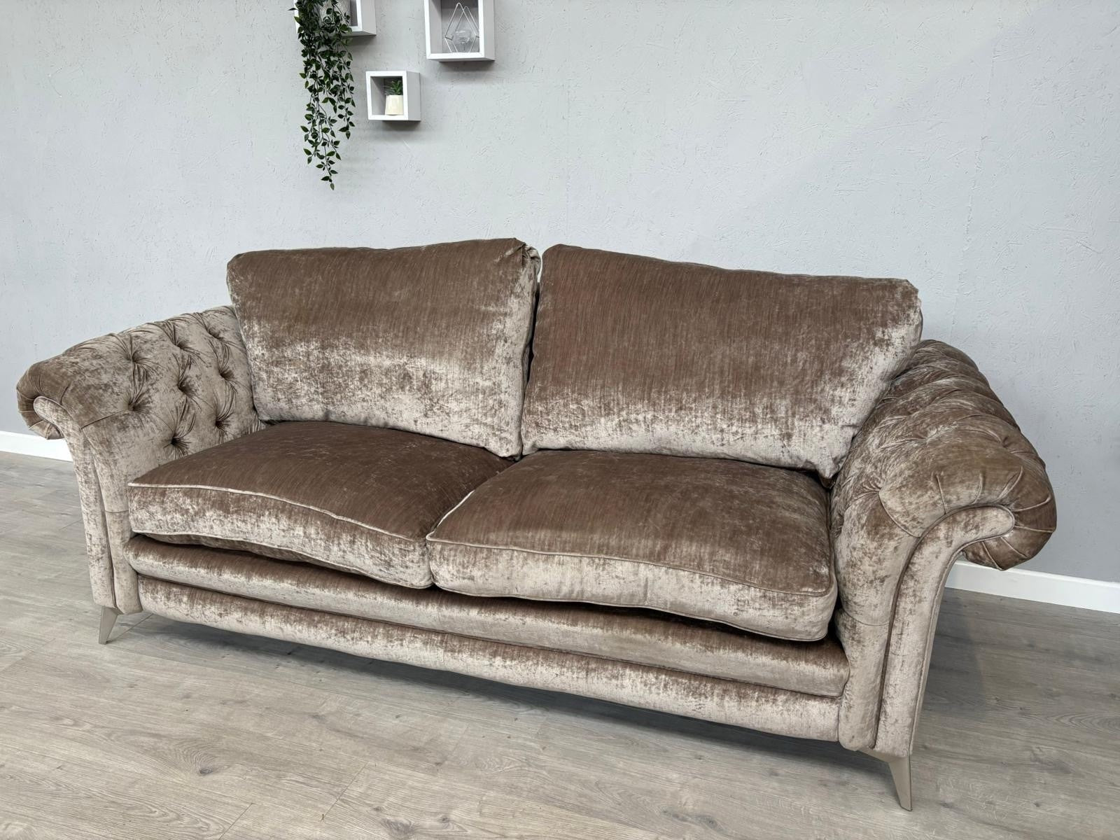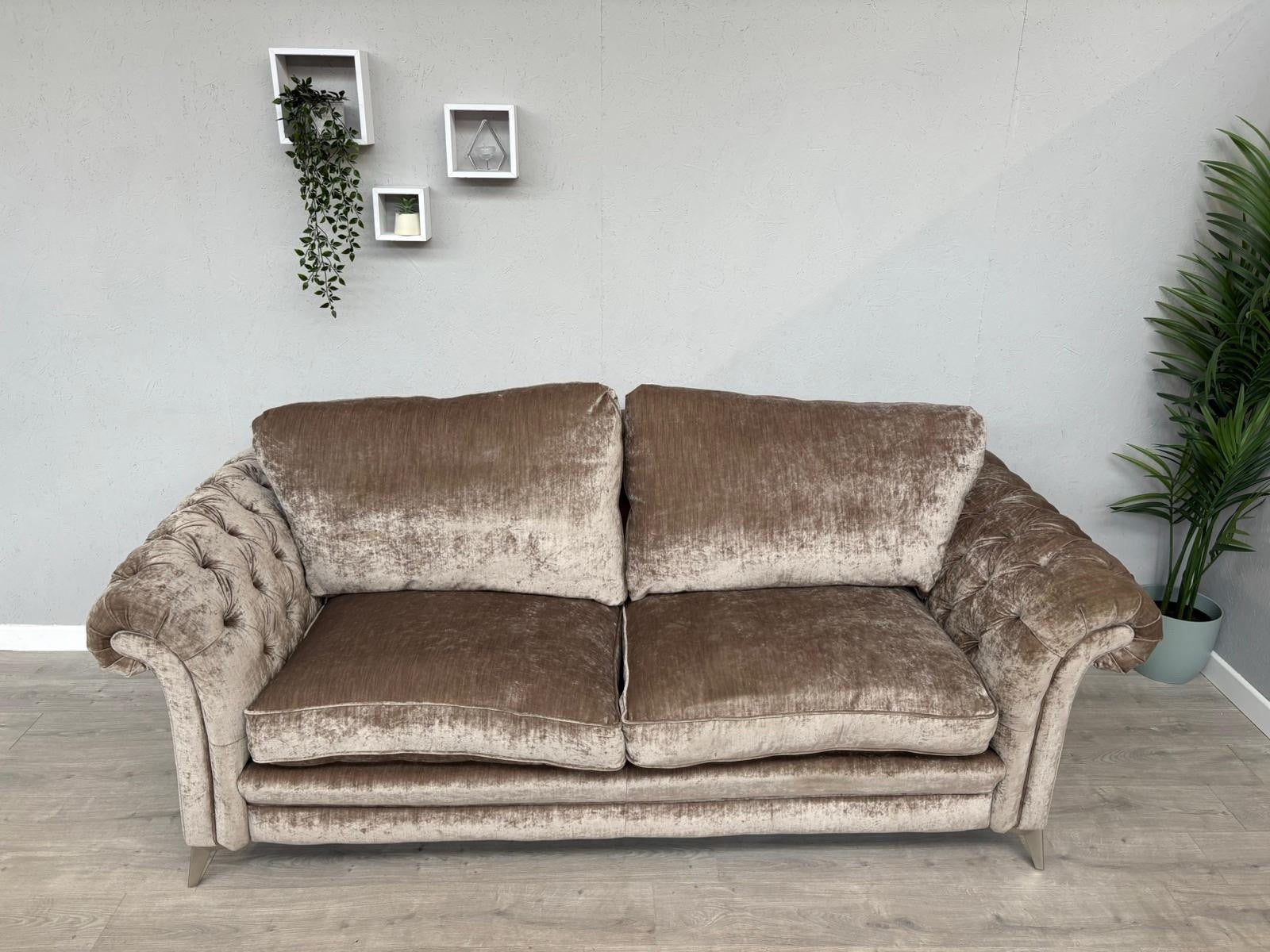 Indulge in the timeless elegance and exceptional comfort of the DFS Loch Leven 3 seater sofa. This sofa is a testament to classic design, featuring gracefully scrolled arms with button tufting that adds a touch of sophistication to any living space.