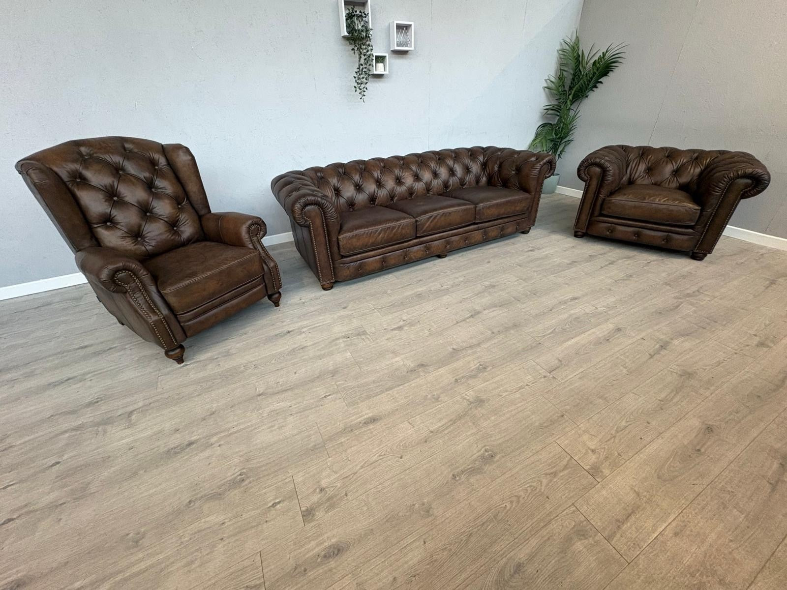 F.V. At The Helm Shackleton Leather Chesterfield 4 Seater Sofa + 2 Chairs, Power