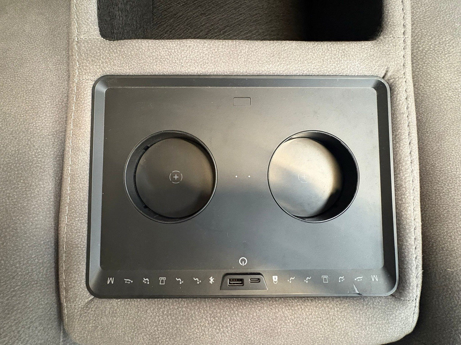 Each panel has Bluetooth and sound controls plus wireless charging and a cup holder.