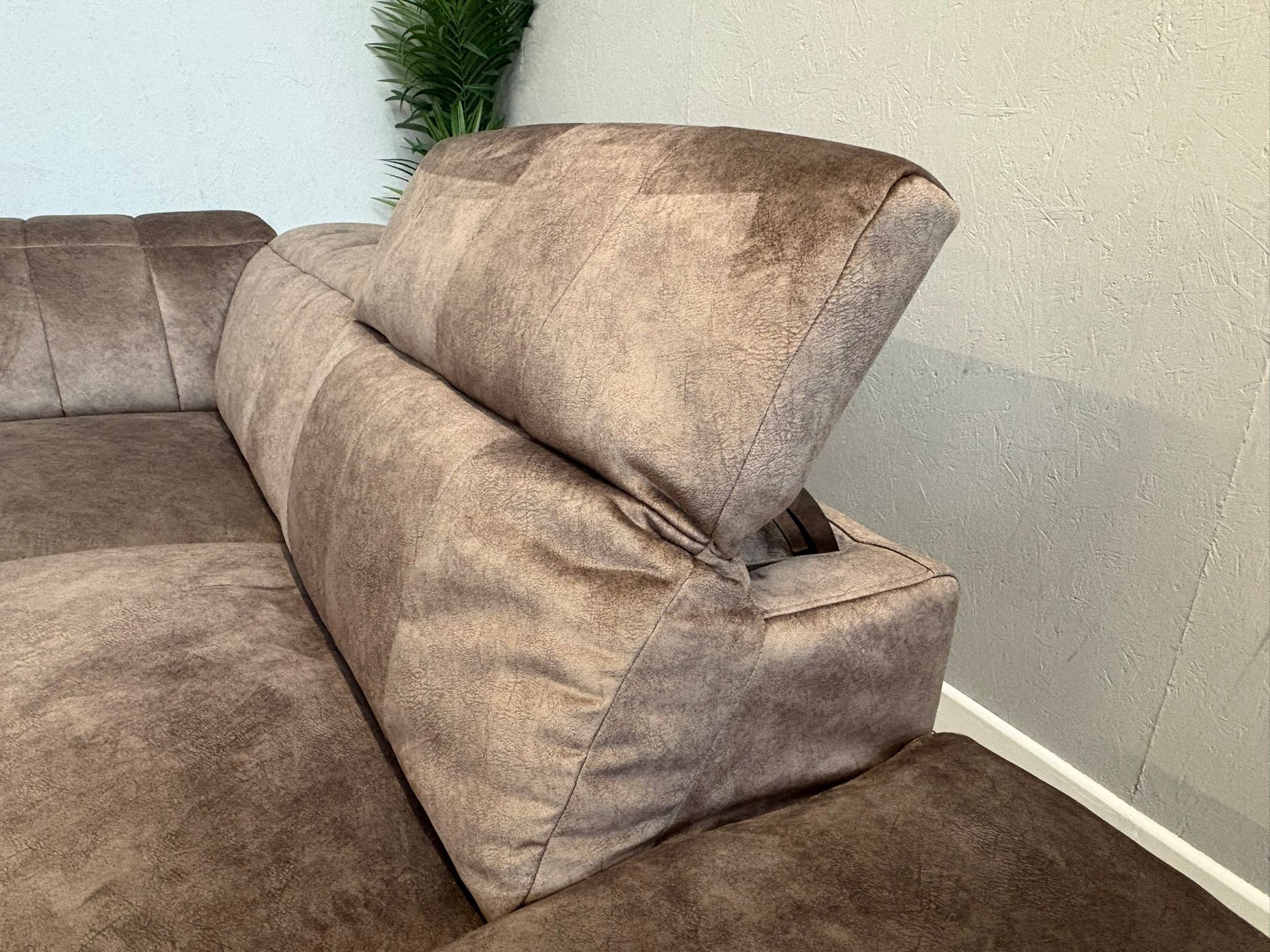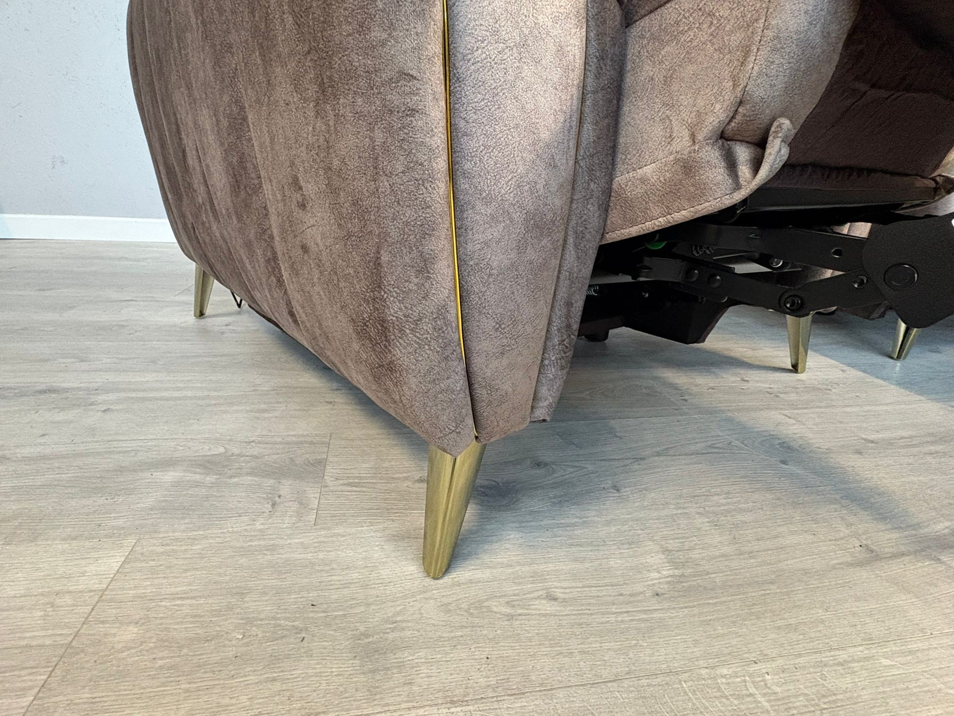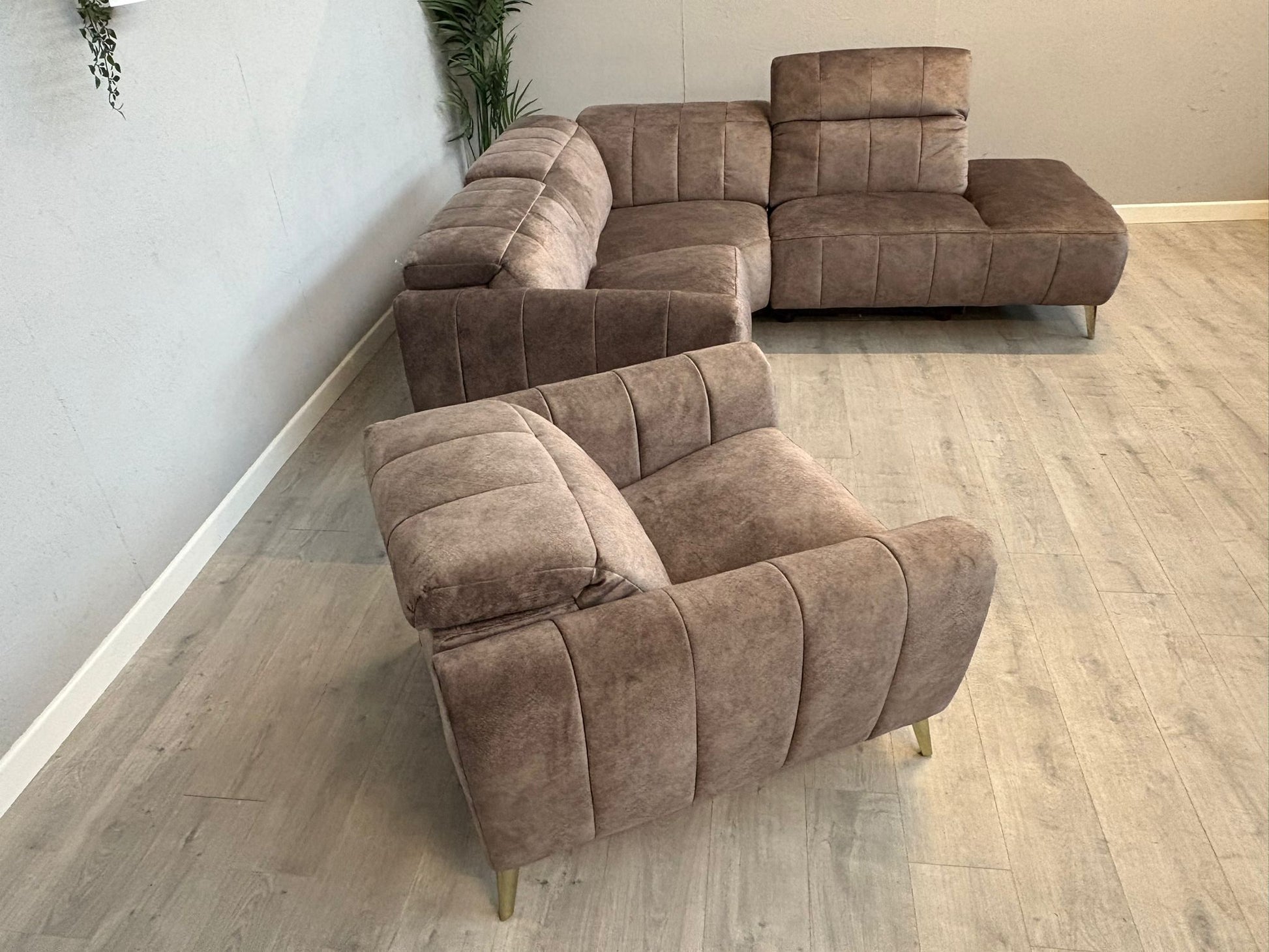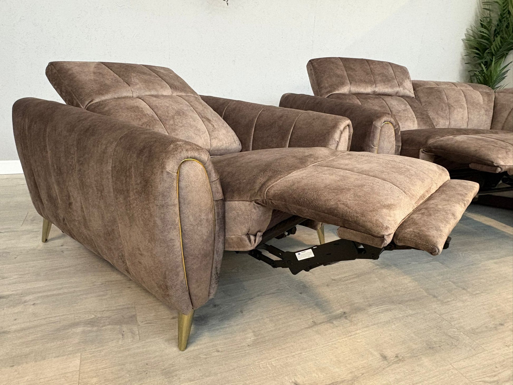 Meet Lidia—where sleek sophistication meets everyday luxury. This stunning corner sofa set pairs a power-reclining chaise with a matching powered armchair, wrapped in Mayson fabric that mimics suede's elegance while delivering velvet's sumptuous feel. The dapple weave features a brushed texture and subtle natural veining for authentic character. Graceful curved edges and rounded arms create a feminine, refined silhouette, whilst opulent gold trim and coordinating feet inject glamorous flair. Inside, coil-sprung seat cushions layered with supportive foam and fibre ensure a plush, durable sit that maintains its shape beautifully. Design your dream family sofa with this versatile, effortlessly chic collection that combines high-tech comfort with timeless style.