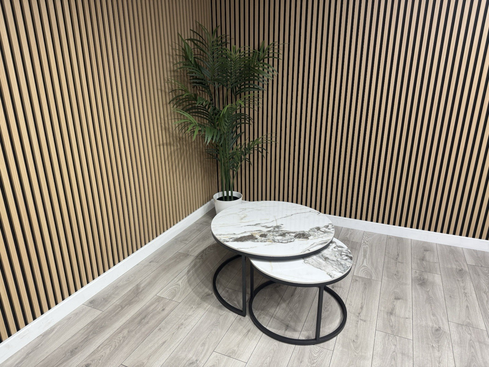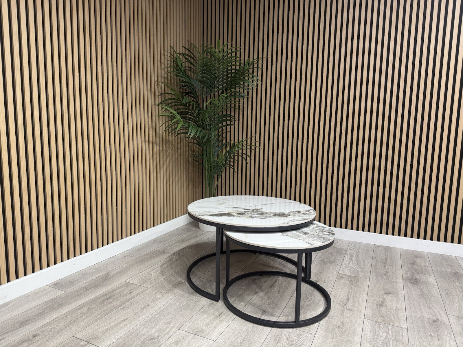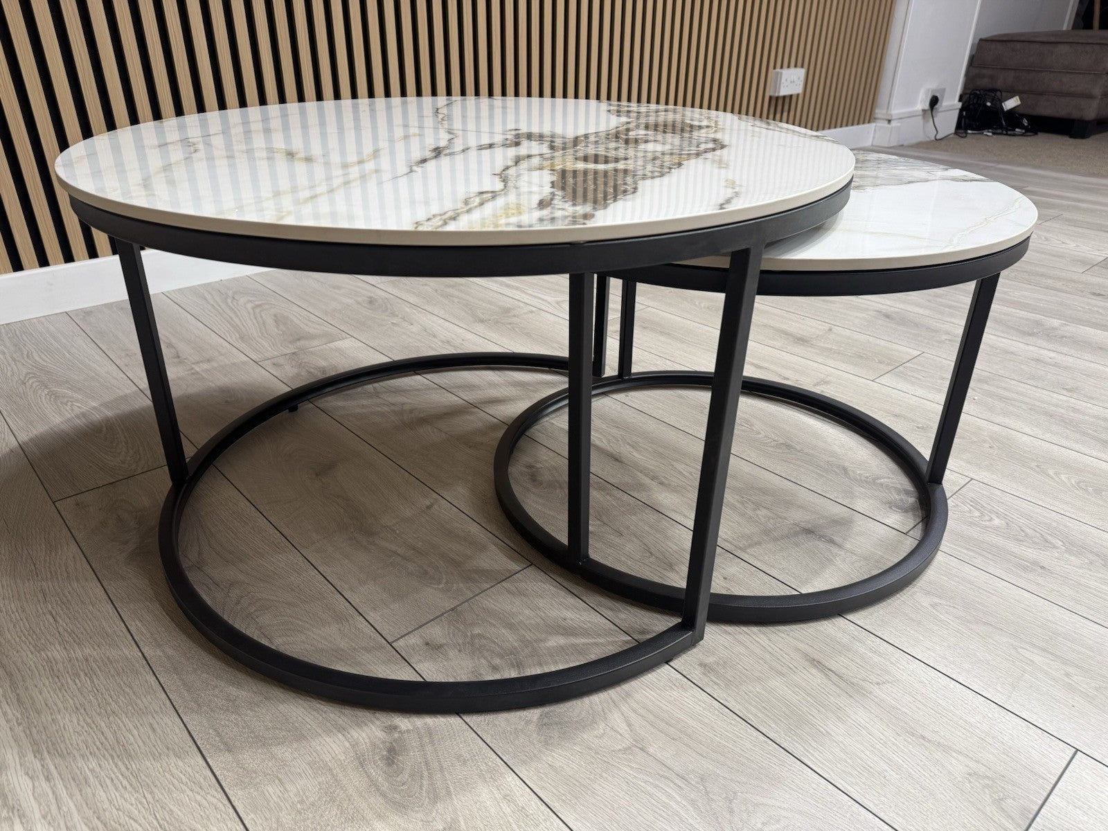Practical and versatile nest of 2 coffee tables. White ceramic top is on-trend and very durable.