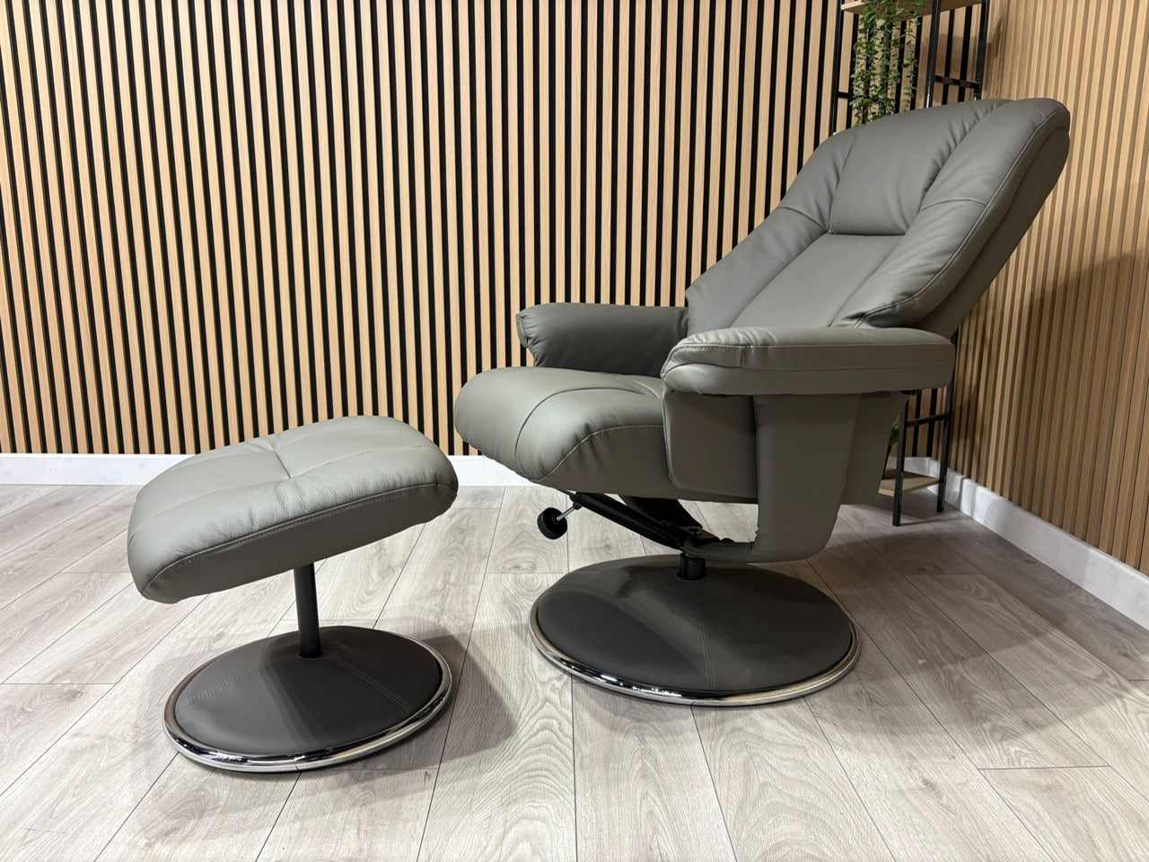 Experience refined relaxation with this elegant swivel recliner armchair paired with a coordinating footstool. Crafted from premium plush leather, it delivers both sophistication and comfort that ages beautifully. Enjoy complete rotational freedom with the smooth 360-degree swivel, whilst the effortless manual recline—controlled by a simple twist handle—adapts to your ideal lounging position. The generously proportioned high back, reinforced with deep contoured foam cushioning, cradles you in supportive comfort for hours of unwinding. Contemporary styling shines through its sleek round base and gleaming chrome accents, making this a striking addition to any modern interior that refuses to compromise on comfort.
