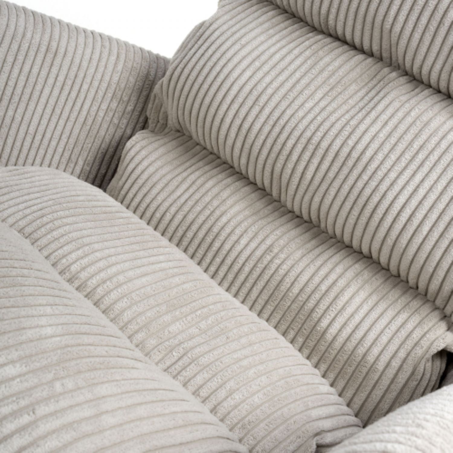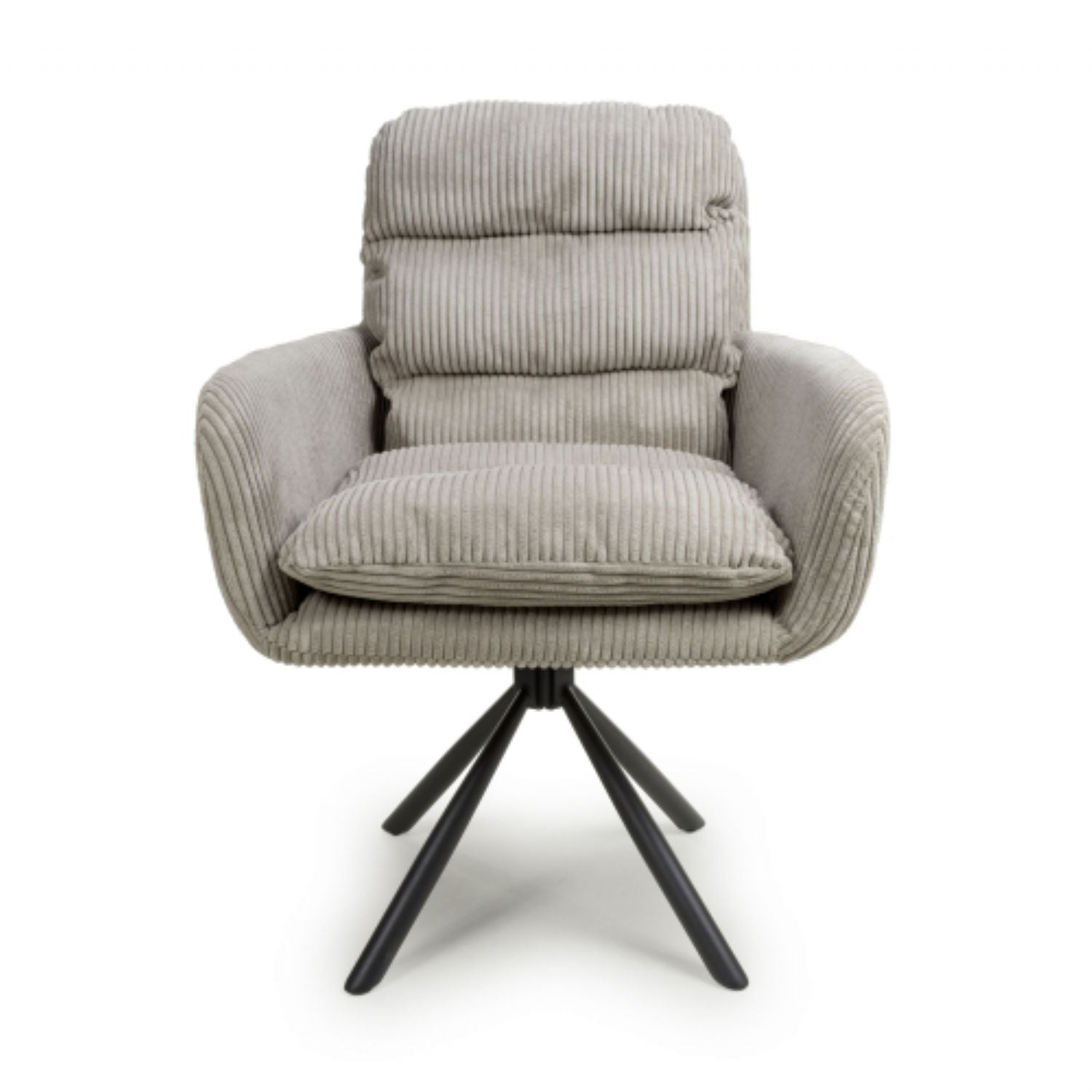 A deluxe cushioned swivel dining chair, upholstered in a beautifully soft, ribbed mink corduroy fabric. The large sloping bucket seat and high armrests provide incredible comfort. The chair comes with exquisitely contoured and pleated cushions, removable for easy cleaning. The black metal tripod base swivels 180 degrees before self returning. The 4 legs come with adjustable feet. Some assembly required.