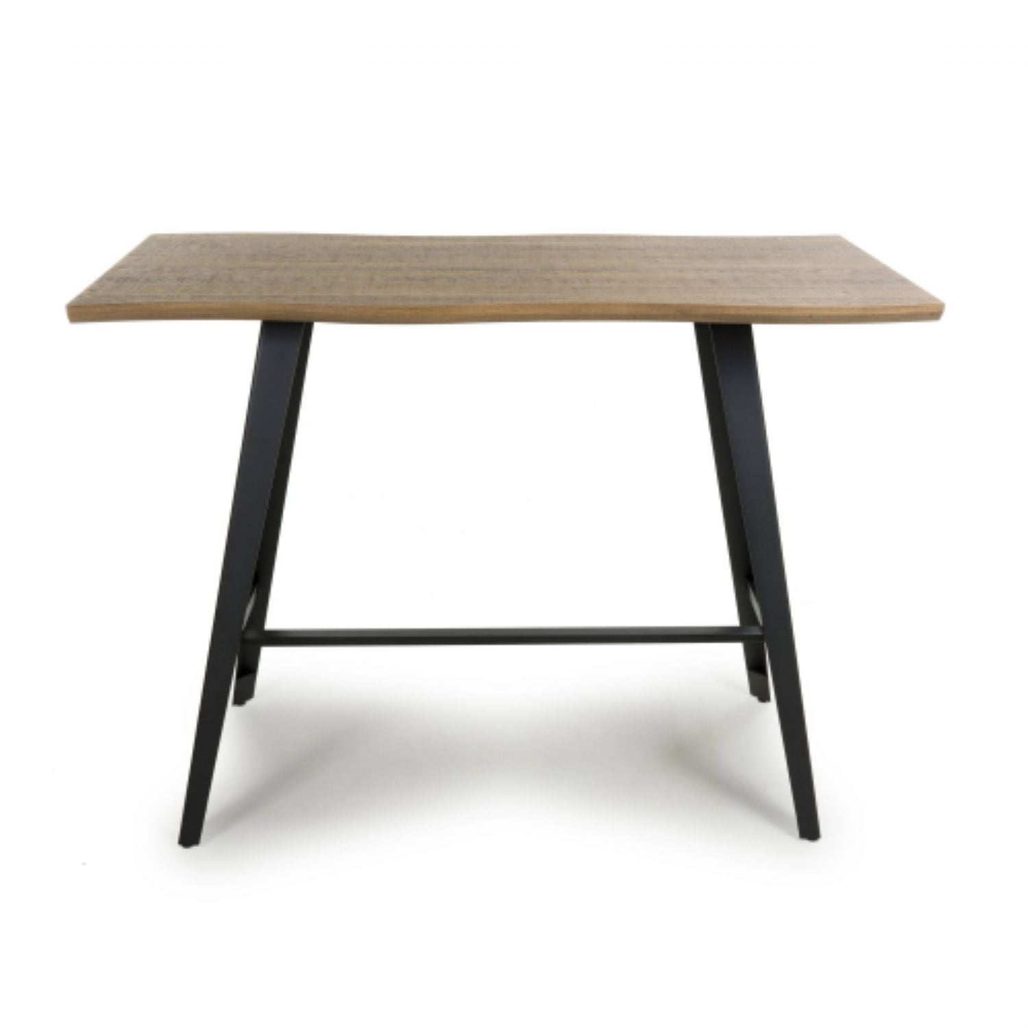 This rectangular curved edge bar table combines a classic blend of industrial and Scandinavian styles. An appealing bevelled wavy cut out edge runs along both sides of its stain resistant wood effect printed 32mm top. The table is sturdily supported by black powder coated iron legs, complete with support bar and adjustable feet. This large bar table can easily accommodate 4 bar stools, making it ideal for kitchen areas. Leg assembly required. Sold individually.