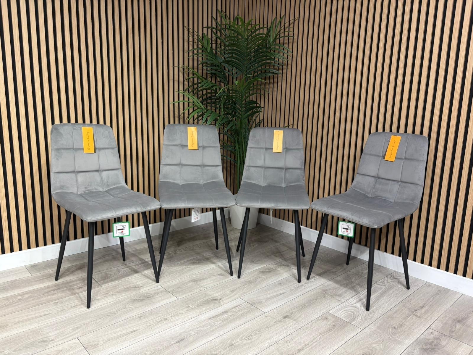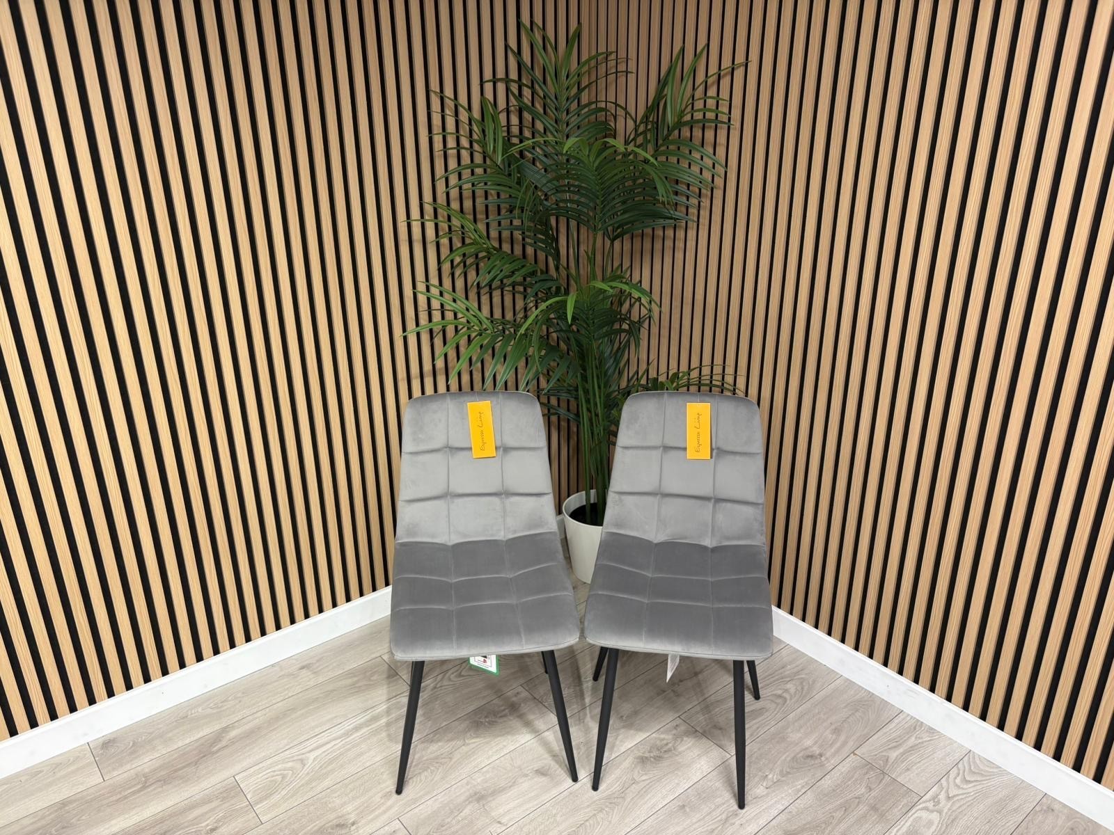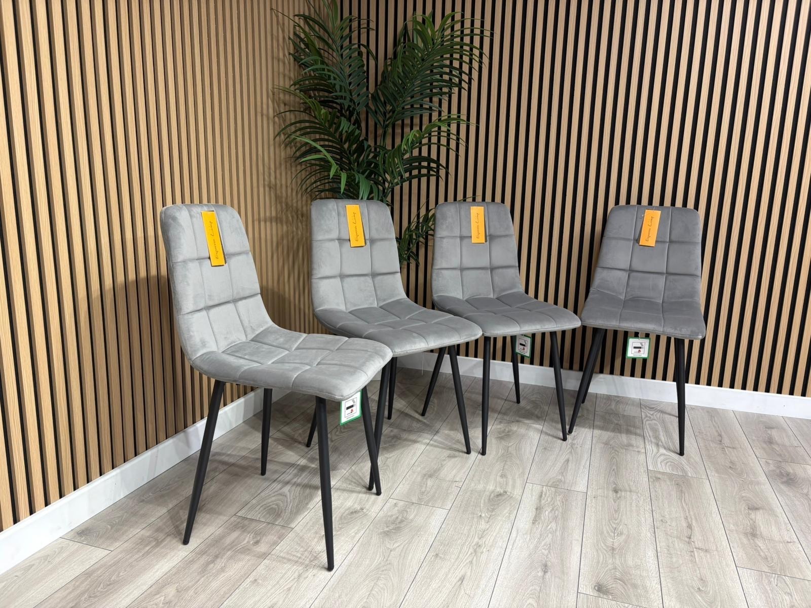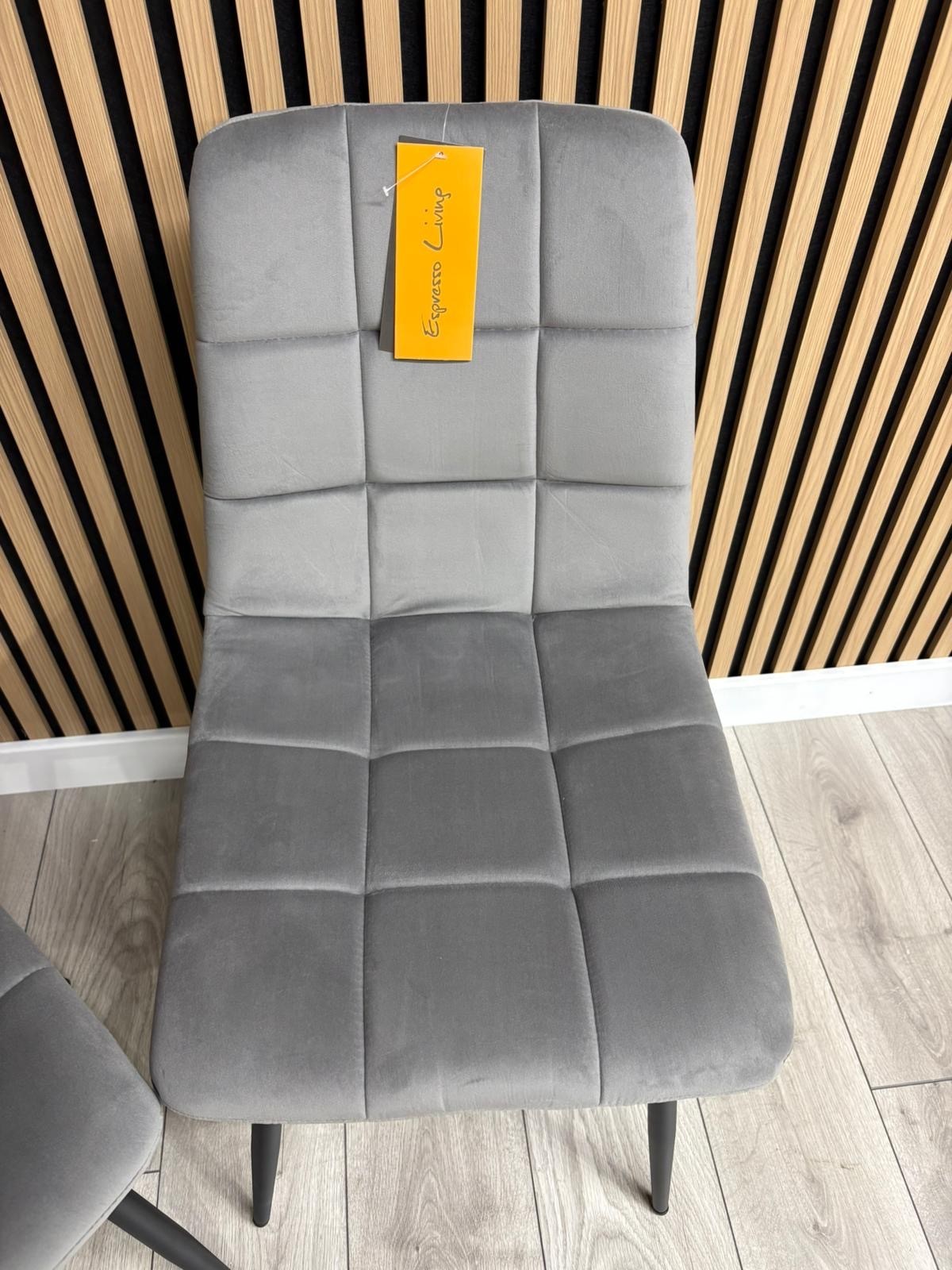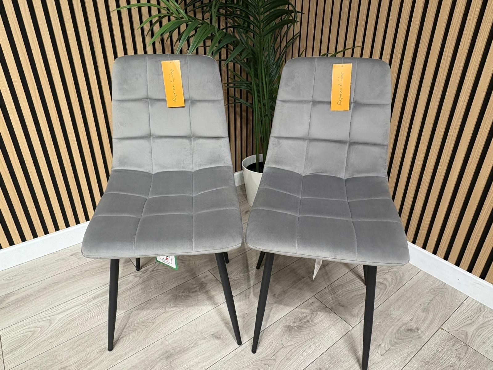 A gently sloped contemporary dining chair, upholstered in sleek grey brushed velvet fabric. The comfortably contoured seat and back feature stylish square panelled stitching. Fitted with cross frame tapered black metal legs. Assembly required. Sold in boxes of 4.