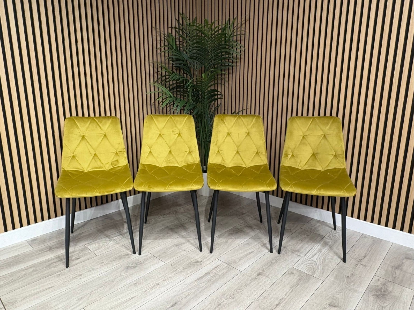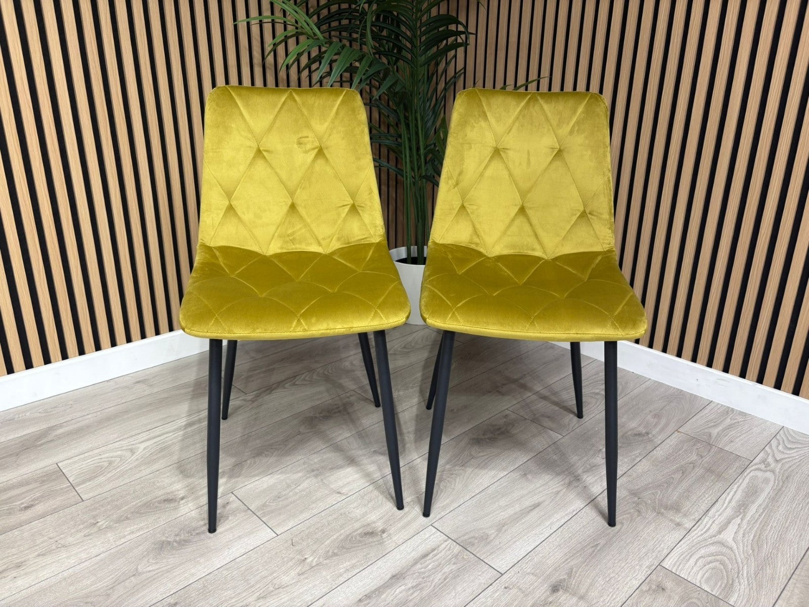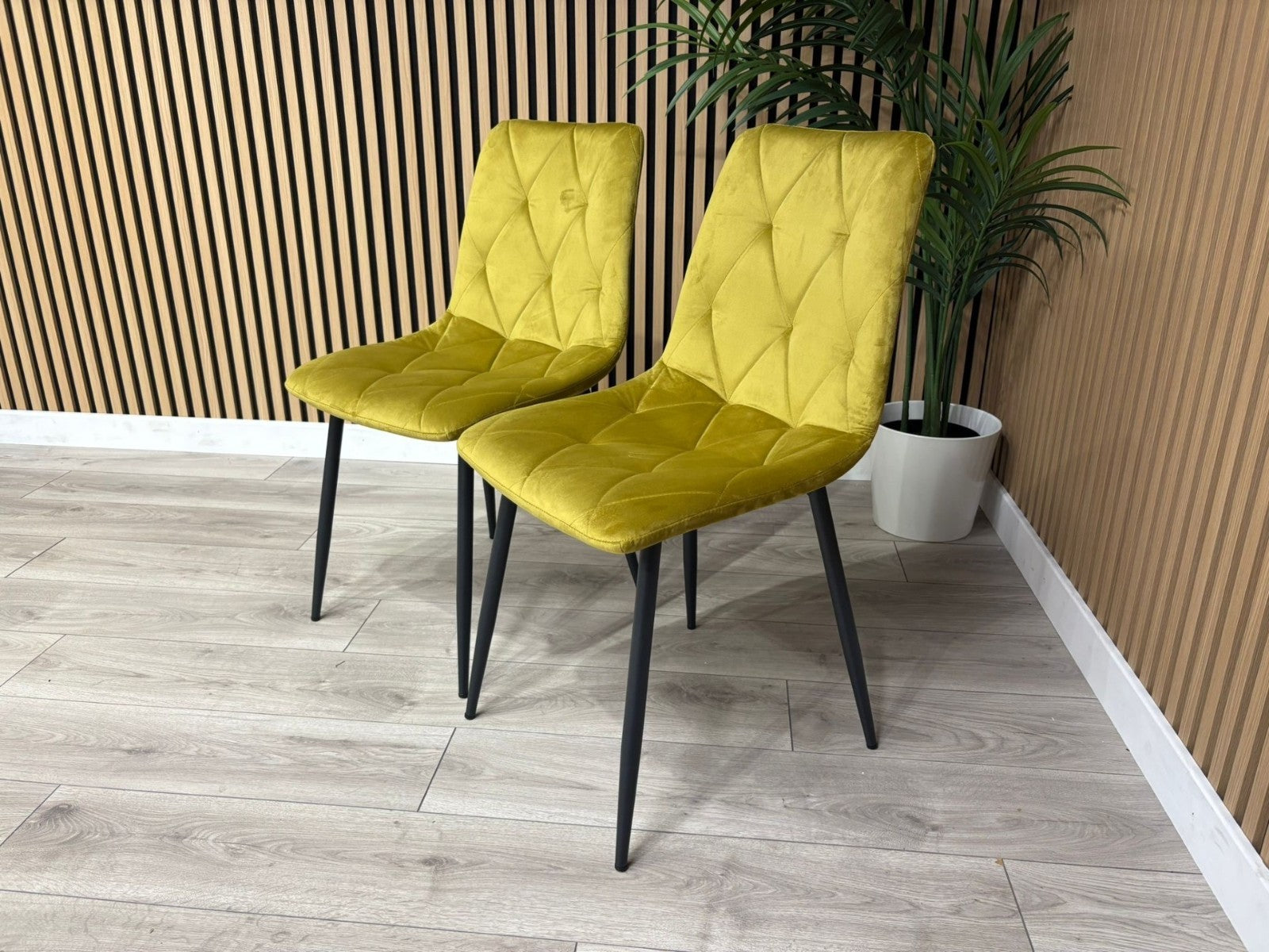 A gently sloped contemporary dining chair, upholstered in sleek Mustard brushed velvet fabric. The comfortably contoured seat and back feature stylish square panelled stitching. Fitted with cross frame tapered black metal legs. Assembly required. Sold in boxes of 4.