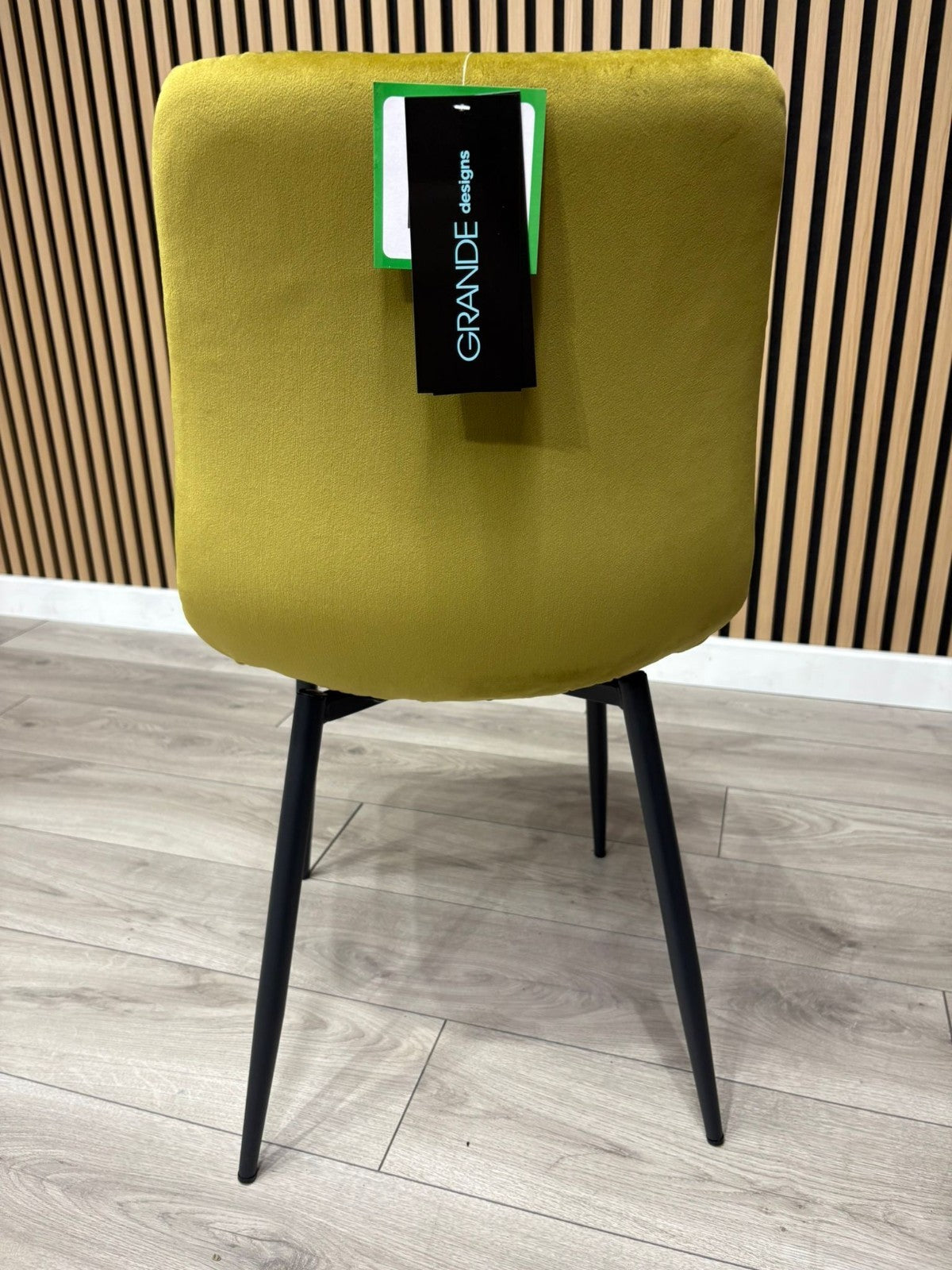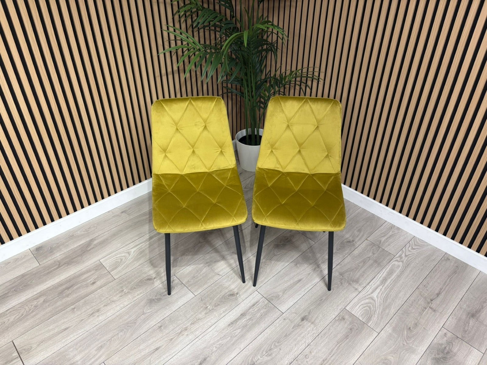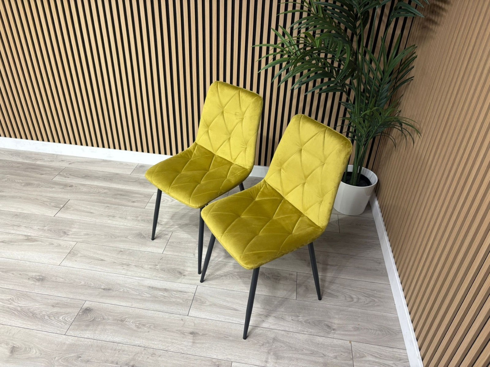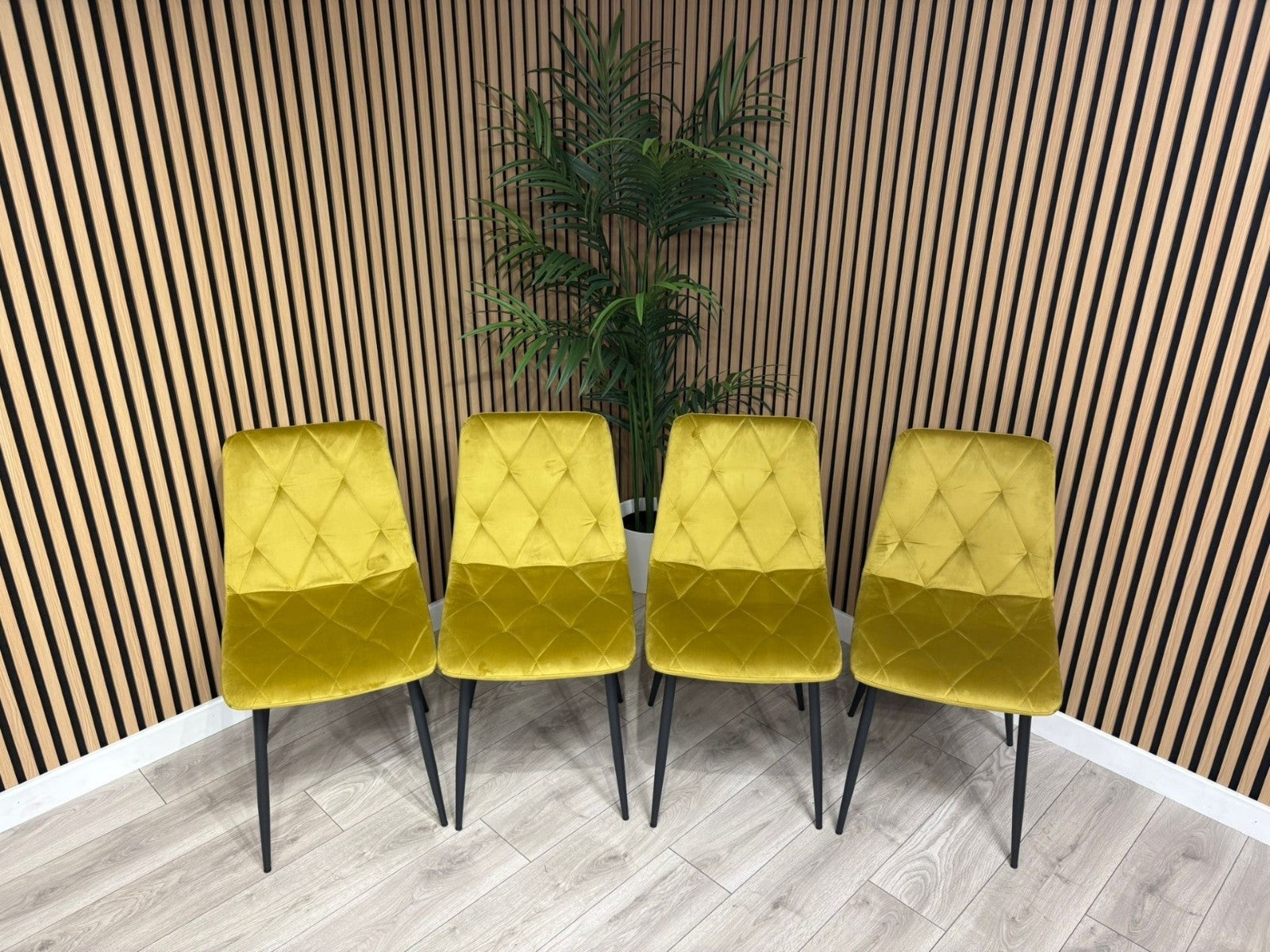 A gently sloped contemporary dining chair, upholstered in sleek Mustard brushed velvet fabric. The comfortably contoured seat and back feature stylish square panelled stitching. Fitted with cross frame tapered black metal legs. Assembly required. Sold in boxes of 4.