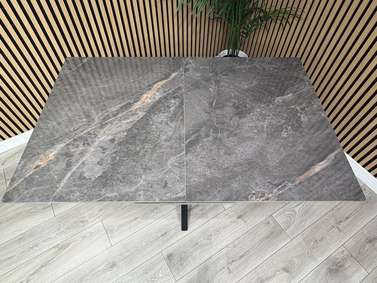 The Crete Medium 1.6m Ceramic Grey Dining Table blends contemporary style with robust construction to enhance your home. It features a grey marble-effect ceramic top measuring 1.1m, highlighted by subtle weathered orange veins for a unique look that's easy to clean.