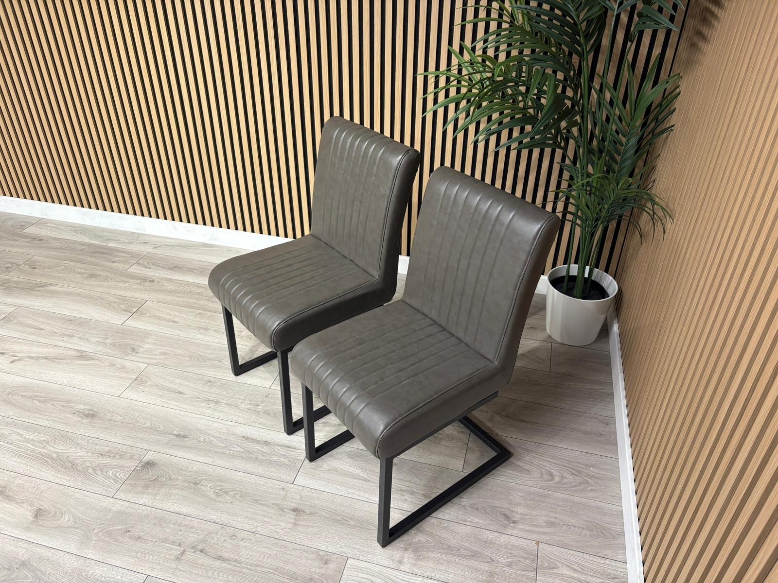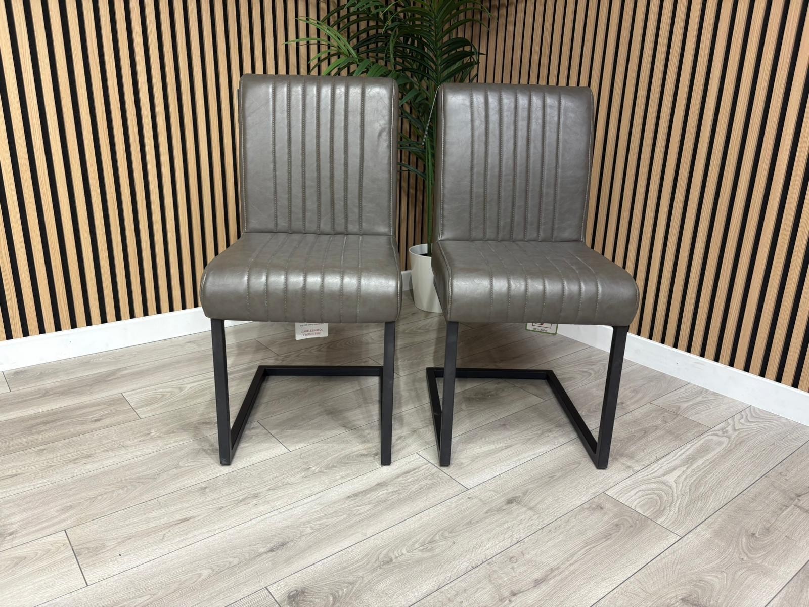 Introducing this modern industrial dining chair with a classy cultured and innovative look that may create any room stand out of the standard. Upholstered during a sturdy grey leather match and its vertical centre stitching and is furnished with dark grey metal cantilever legs. Assembly needed. Sold in boxes of two.