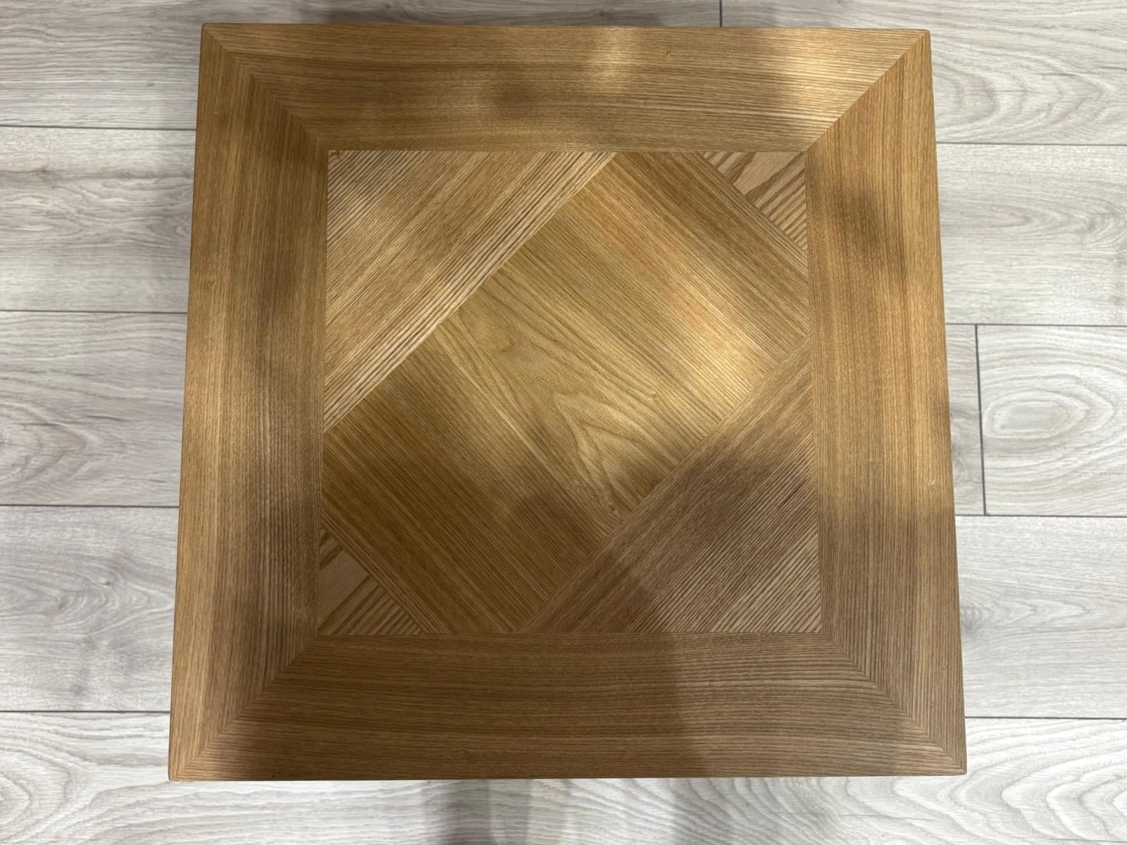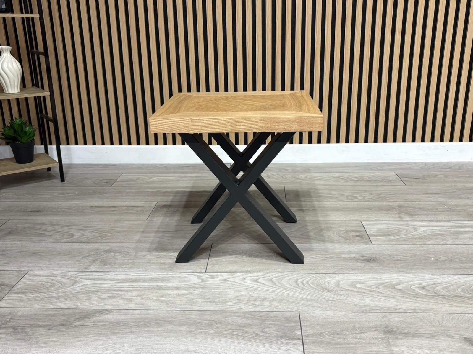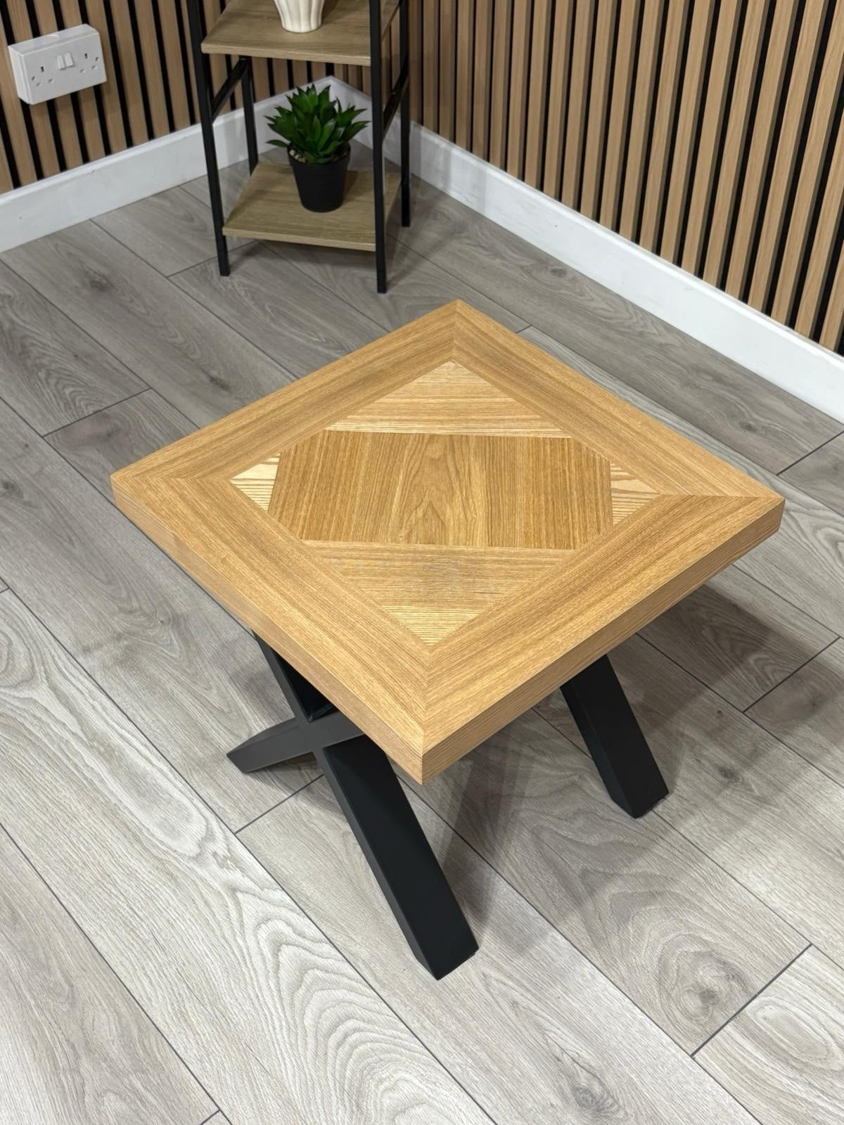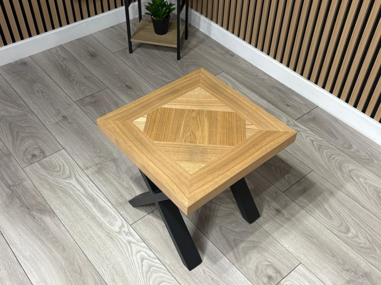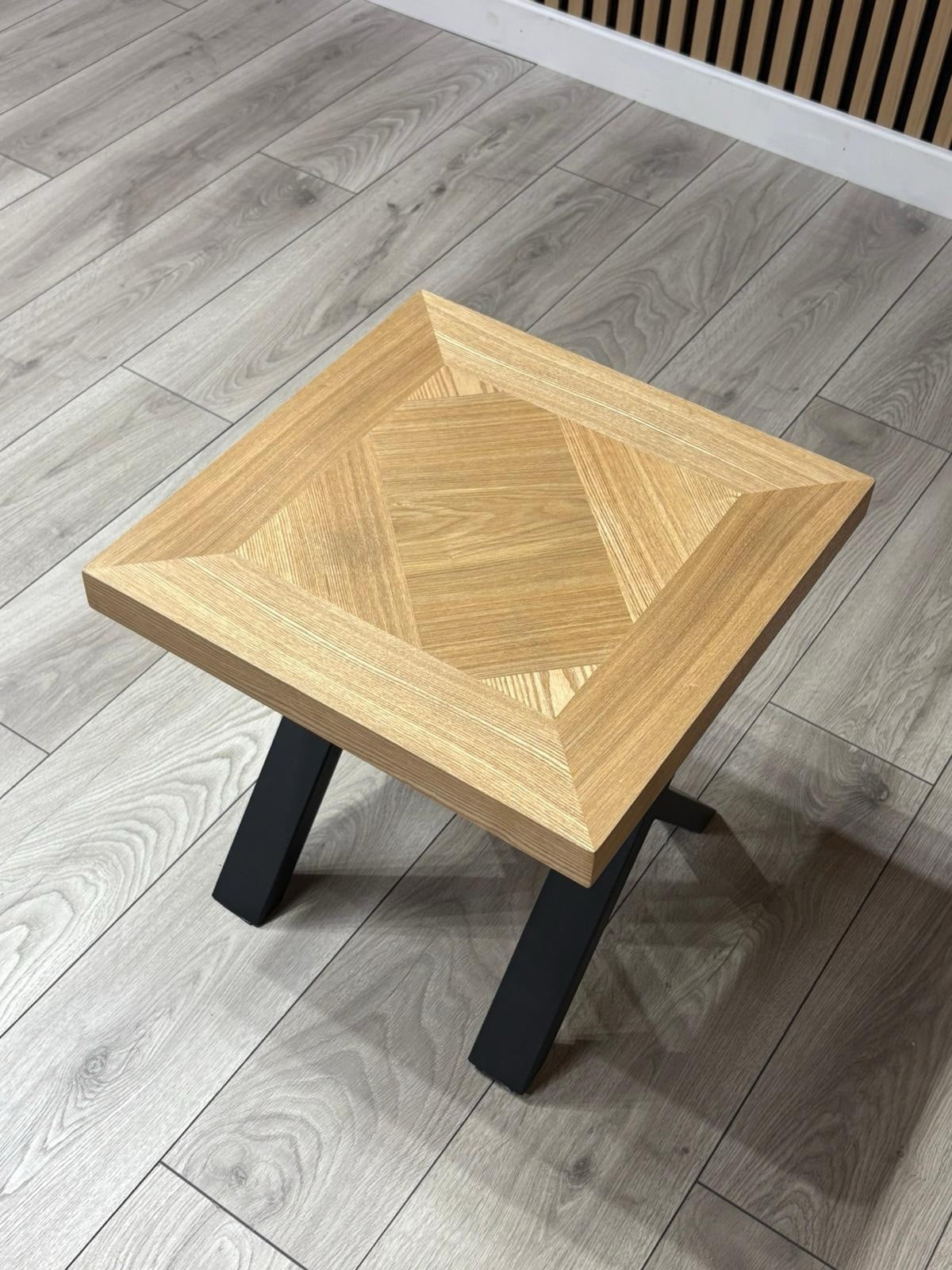 This elegant 45cm square end table features a sturdy 40mm top beautifully finished in a medium oak parquet veneer. The intricately crafted diagonal design showcases exceptional craftsmanship. Supported by sleek black powder-coated iron legs, this versatile lamp table can be used in a variety of spaces. Some assembly required.