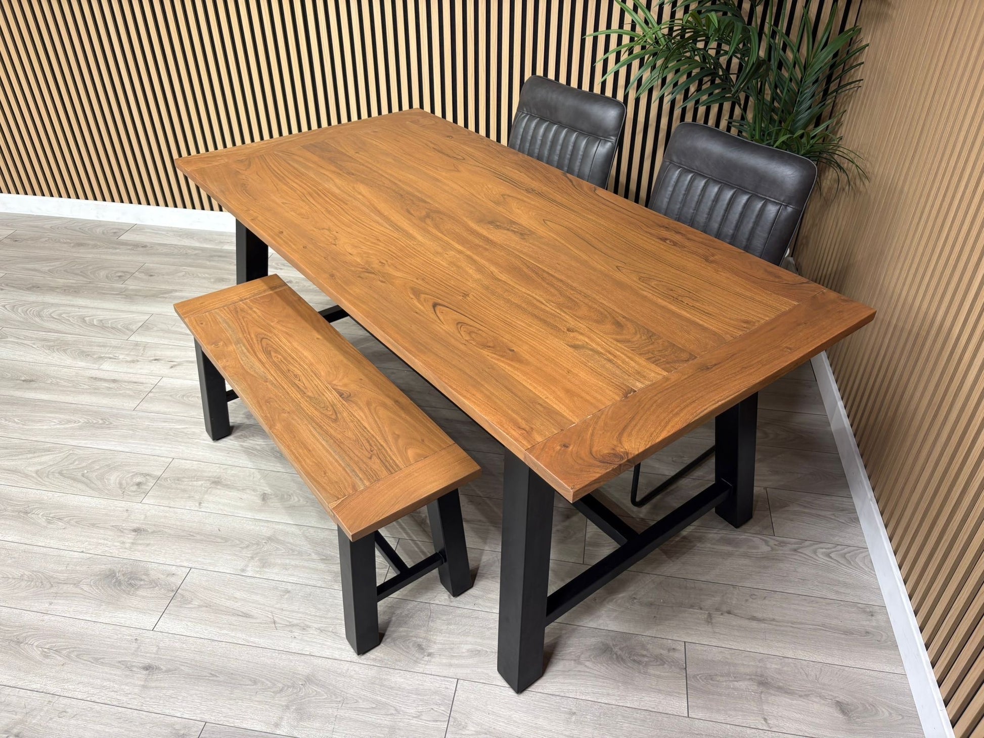 The New Bronx Dining Set combines striking acacia wood craftsmanship with contemporary design, creating a complete dining solution for modern homes. This versatile set includes a spacious table, comfortable bench, and two PU leather chairs—everything needed to transform your dining space. The rich wood finish pairs beautifully with both modern and traditional interiors, whilst the durable construction ensures it withstands years of family meals and entertaining. From intimate dinners to lively gatherings, the New Bronx delivers the perfect balance of style, comfort, and practicality for any occasion.