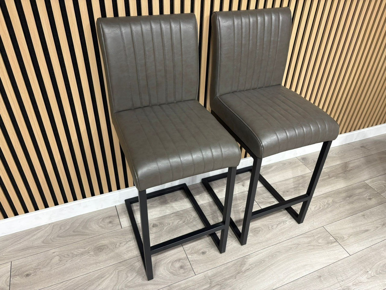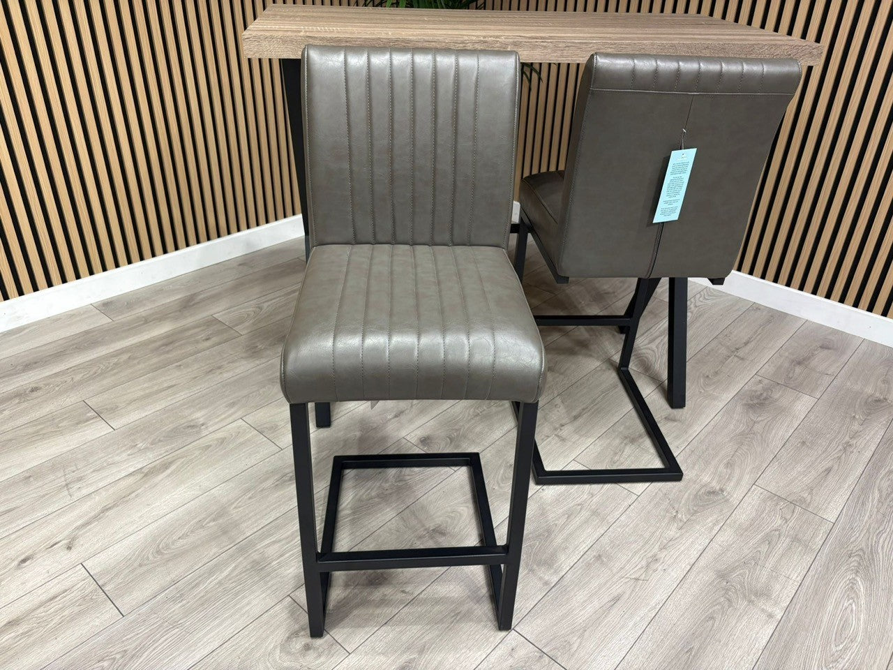 Introducing this modern industrial bar stools with a classy cultured and innovative look that may create any room stand out of the standard. Upholstered during a sturdy grey leather match and its vertical centre stitching and is furnished with dark grey metal cantilever legs. Assembly needed. Sold in boxes of two.