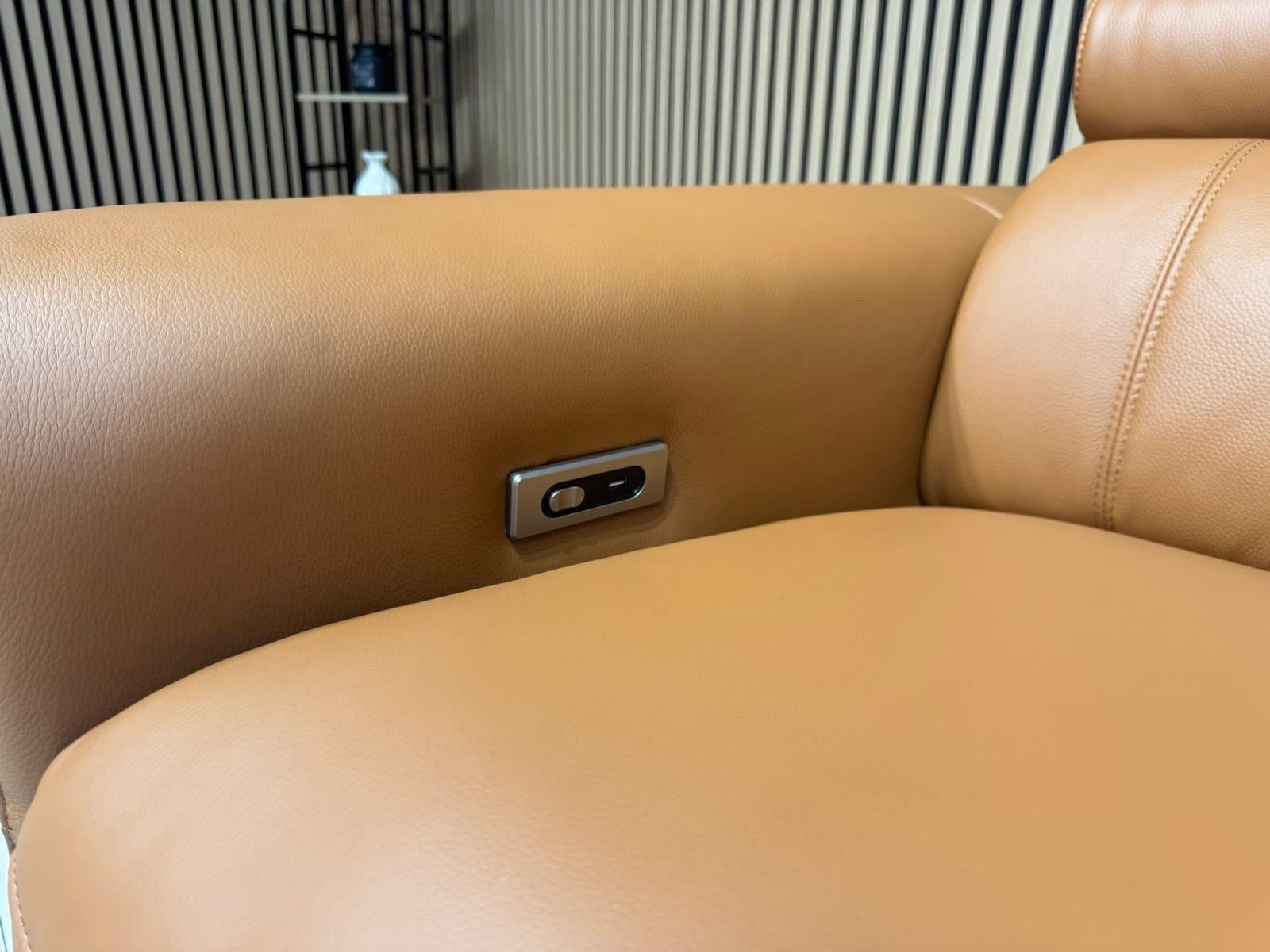 This stunning leather corner sofa with chrome detailing on the arms comes with power recliners on both ends and ratchet headrests that are adjustable to suit your needs.Also includes console with storage and cup holders.Fully modular so can be arranged as required.