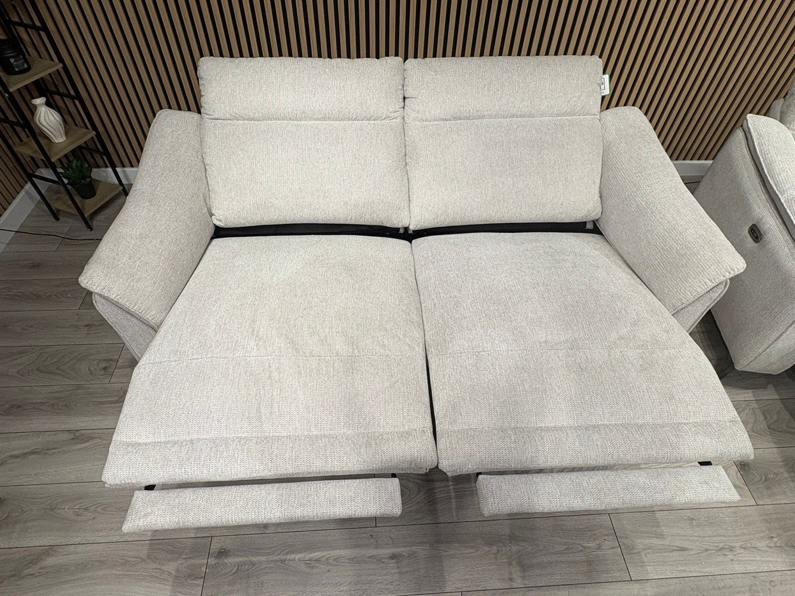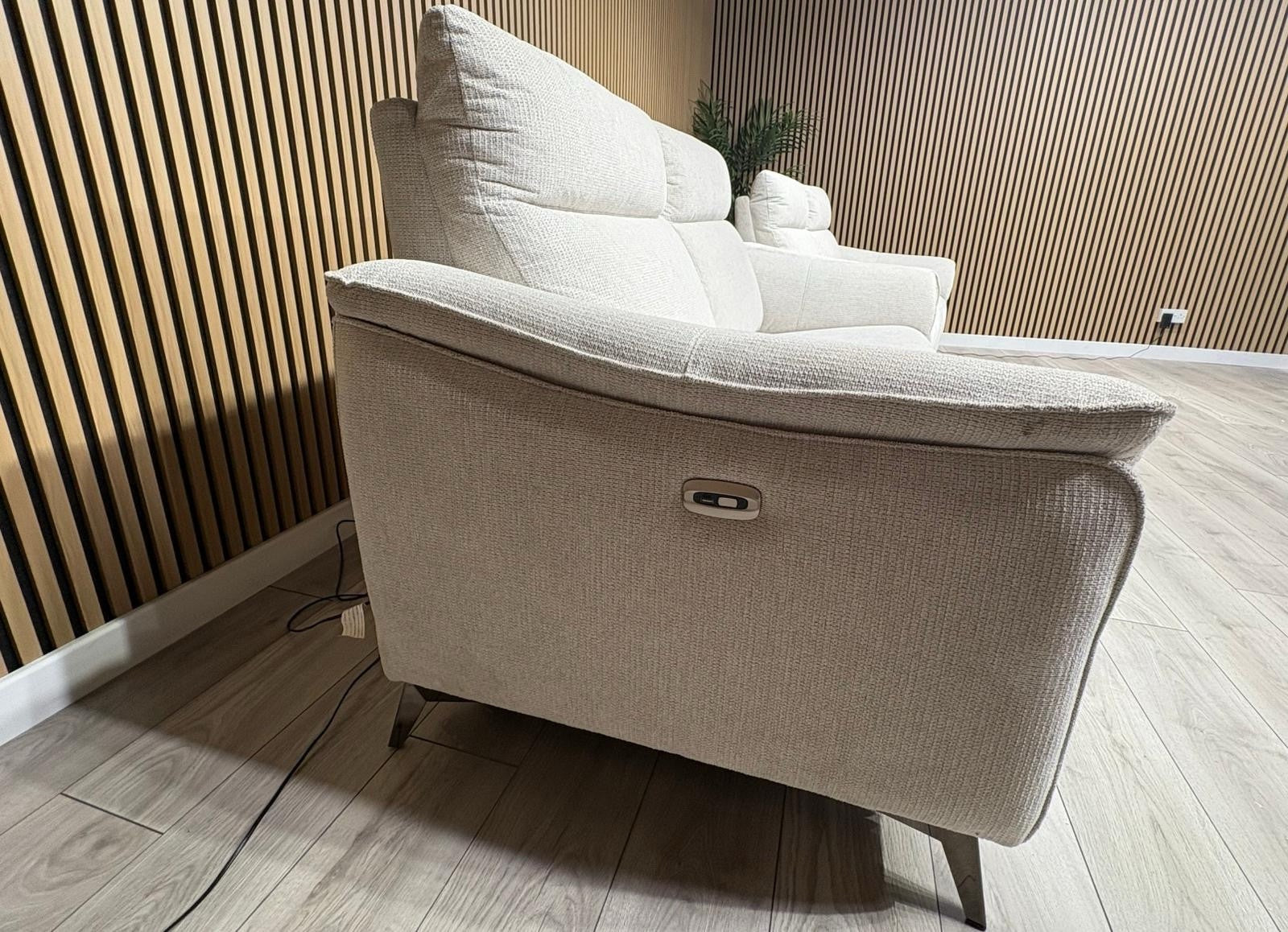 The Vicenza offers modern comfort with effortless reclining at the touch of a button. Upholstered in a soft light grey fabric with padded armrests, supportive high backs and smooth power recline seats for relaxing in style.