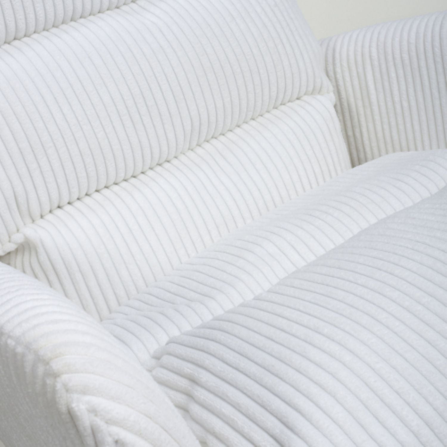 A deluxe cushioned swivel dining chair, upholstered in a beautifully soft, ribbed white corduroy fabric. The large sloping bucket seat and high armrests provide incredible comfort. The chair comes with exquisitely contoured and pleated cushions, removable for easy cleaning. The black metal tripod base swivels 180 degrees before self returning. The 4 legs come with adjustable feet. Some assembly required.